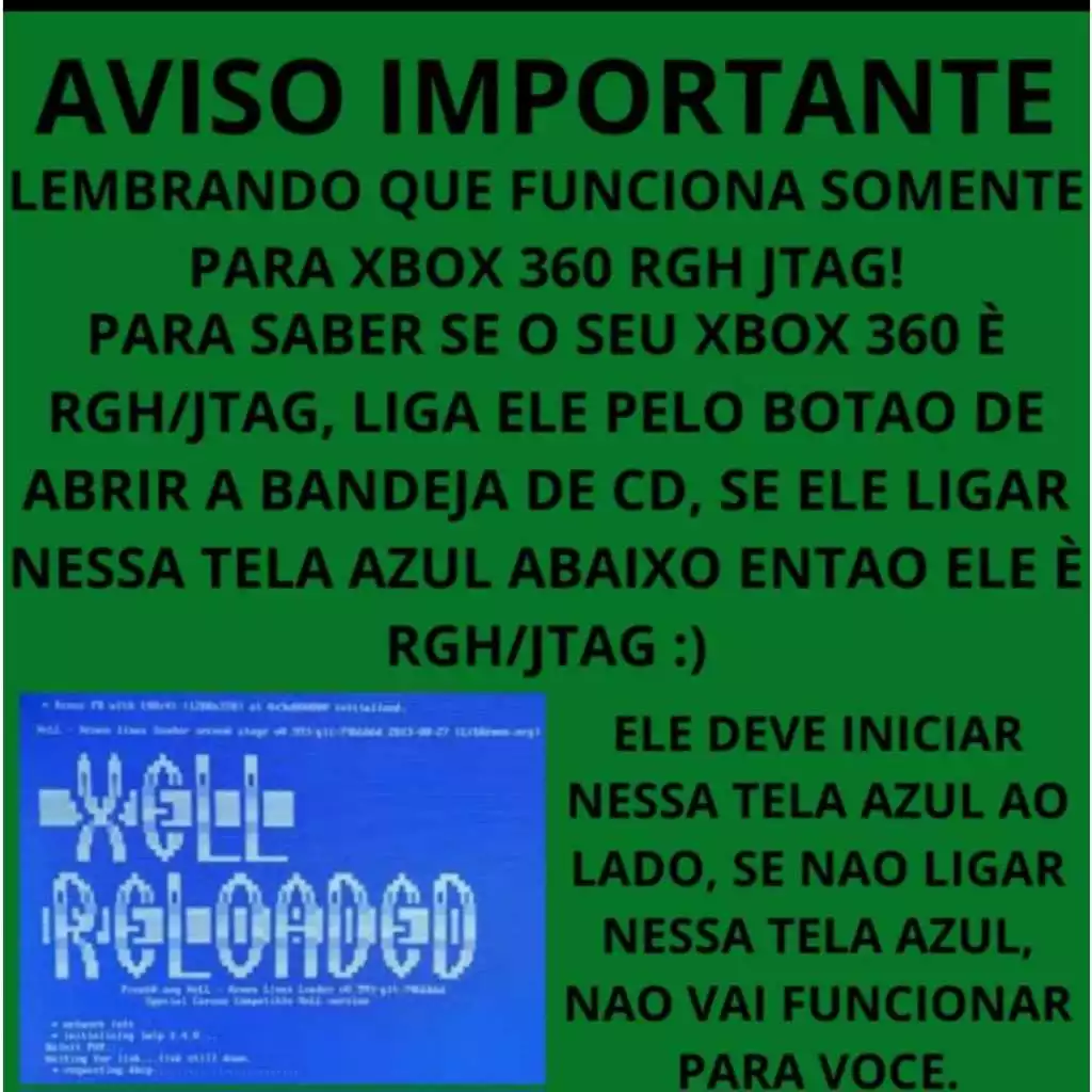 Atenção: Se surgir uma tela azul com o nome XELL RELOADED, parabéns! Seu Xbox 360 é compatível com desbloqueio (JTAG ou RGH).