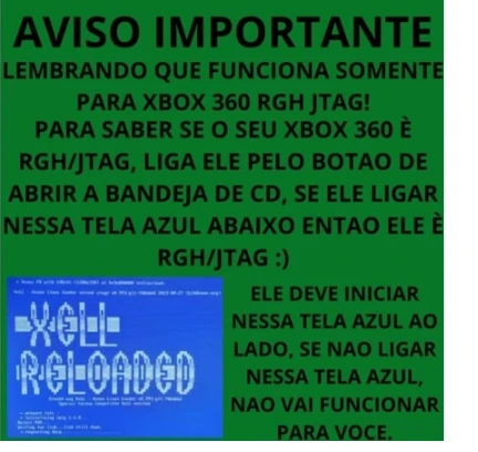Atenção: Se surgir uma tela azul com o nome XELL RELOADED, parabéns! Seu Xbox 360 é compatível com desbloqueio (JTAG ou RGH).